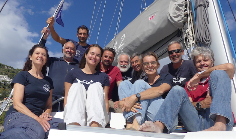 Cette année, l’équipe était composée de 10 chercheurs et bénévoles enthousiastes : Hervé, Pascale et Lilou, 3 acousticiens pour mener à bien tous les enregistrements sonores, Rémy le pilote du Zodiac, Denis aux manettes du drone, Baptiste à l’œil aiguisé et la réflexion si nourrissante, François et Véronique à la photo d’identification, ainsi que les indispensables skippers Eric et Jean-Christophe qui ont fait des merveilles pour la bonne marche du bateau et de la mission.
