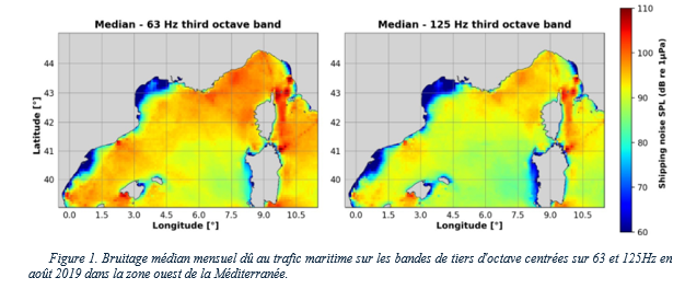 Le développement exponentiel des activités humaines depuis le siècle dernier a conduit à une redéfinition du paysage sonore sous-marin. Le bruit sous-marin d’origine anthropique représente une forme omniprésente de pollution marine, en particulier dans les zones à fort trafic maritime et les zones côtières développées. En mer Méditerranée, le trafic maritime induit une forte augmentation des niveaux acoustiques à des niveaux qui interfèrent directement avec les fréquences vitales des mammifères marins (entre 10Hz et 200Hz). Les données présentées ci-dessous font état de la pollution sonore sous-marine directement liée au trafic maritime dans la zone ouest de la Méditerranée[9].